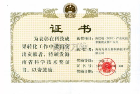 海南萬(wàn)維在諾麗產(chǎn)業(yè)化實(shí)施的9年中,創(chuàng)建海巴戟種質(zhì)資源圃,選育出我國(guó)首個(gè)海巴戟栽培品種“萬(wàn)維1號(hào)”海巴戟,采用“公司+農(nóng)戶+行業(yè)協(xié)會(huì)”模式對(duì)優(yōu)良種苗和栽培技術(shù)成果進(jìn)行推廣和服務(wù)三農(nóng),項(xiàng)目依托發(fā)明專利創(chuàng)建了海巴戟產(chǎn)品深加工基地,向十幾家企業(yè)推廣技術(shù)成果并取得可觀經(jīng)濟(jì)和社會(huì)效益。項(xiàng)目制定了規(guī)范化種植和產(chǎn)品深加工標(biāo)準(zhǔn)15個(gè),其中1個(gè)上升為海南省地方標(biāo)準(zhǔn),15個(gè)標(biāo)準(zhǔn)在生產(chǎn)中應(yīng)用并填補(bǔ)行業(yè)空白。海南萬(wàn)維被確認(rèn)為國(guó)家高新技術(shù)企業(yè),項(xiàng)目榮獲科技部農(nóng)村科技創(chuàng)新創(chuàng)業(yè)大賽“一等獎(jiǎng)”海南省科技進(jìn)步“二等獎(jiǎng)”和萬(wàn)寧市科技進(jìn)步“一等獎(jiǎng)”等多項(xiàng)榮譽(yù)。