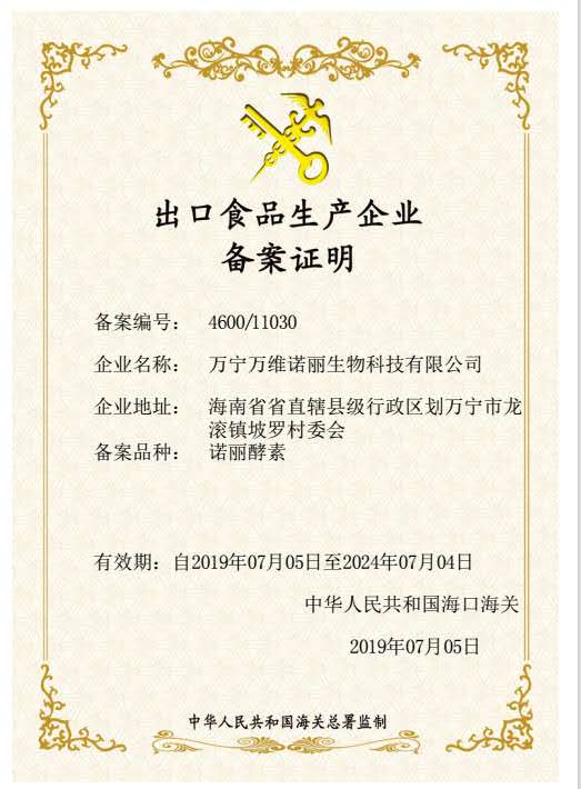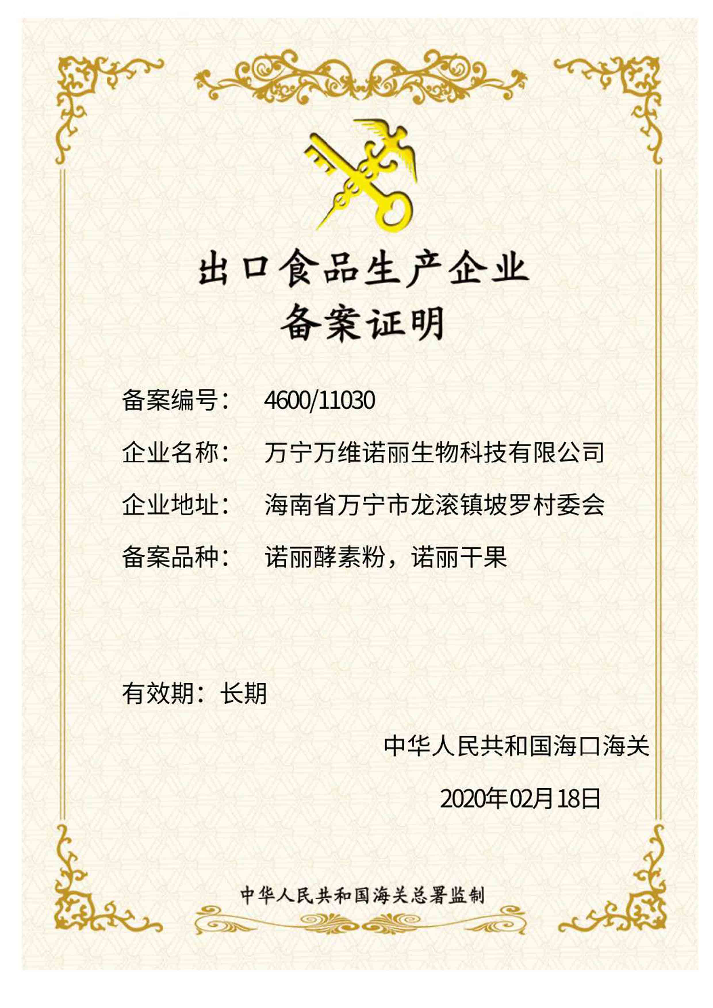 近日,經(jīng)文昌海關(guān)審核批準(zhǔn),我司在原有出口備案品種的基礎(chǔ)上,又新增了“諾麗酵素粉,諾麗干果”兩項(xiàng)出口備案品種(備案號(hào):4600/11030)(圖2)。到目前為止,我司的出口備案品種由原來的1項(xiàng)增加到3項(xiàng),分別是:諾麗酵素(圖2),諾麗酵素粉和諾麗干果。三項(xiàng)備案品種涵蓋了我司從諾麗原料到產(chǎn)品的全部生產(chǎn)類別,備案品種的增加也為我司的諾麗原料及產(chǎn)品出口提供更全面的資質(zhì)保障。
