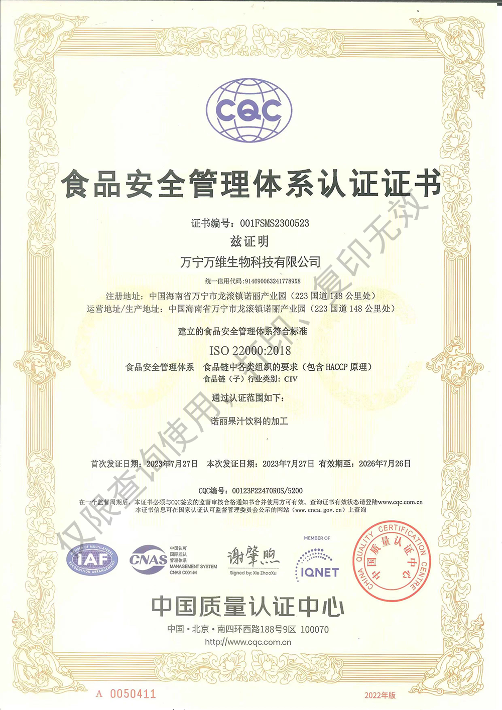 食品安全管理體系認(rèn)證證書